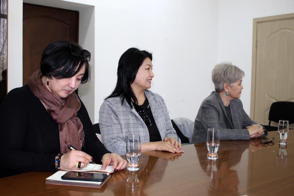 Маалымат учун: “Кыргызстандын аялдарынын демократиялык тармагы” коомдук фонду жигердуу жарандык позицияны карманып, иш алып барган Кыргызстандагы саясий партиялардан, бейөкмөт уюмдардан, айылдык жана шаардык кеңештердин ичинен чыккан депутат аялдарынын демилгеси менен 2012-жылы түзүлгөн. Аталган коомдук фонд чечим кабыл алуу деңгээлинде аялдардын лидер болушуна көмөктөшөт. Уй-бүлөлүк зомбулукка каршы күрөшүү боюнча иш жургузот. Жергиликтүү кеңештердин аял депутаттарынын дараметин жогорулатуу боюнча иштеп келишет. Бугунку жолугушууга аталган коомдук фонддун атынан Бибигуль Бупебаева, Гульжан Байбетова, Дамира Оморова, Алма Карсымбек катышты.
