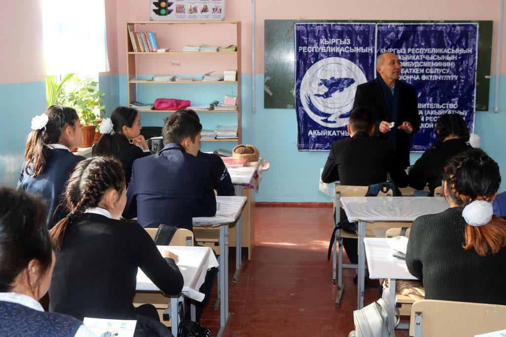 В частности, 26 ноября 2018 года была проведена встреча с учениками 9 класса СШ им. Ленина и с учащимися 8-9 классов СШ им. Айтпая Имарова. Сотрудники института Акыйкатчы рассказали молодежи об их основных правах и свободах, которые прописаны и закреплены во Всеобщей декларации прав человека.