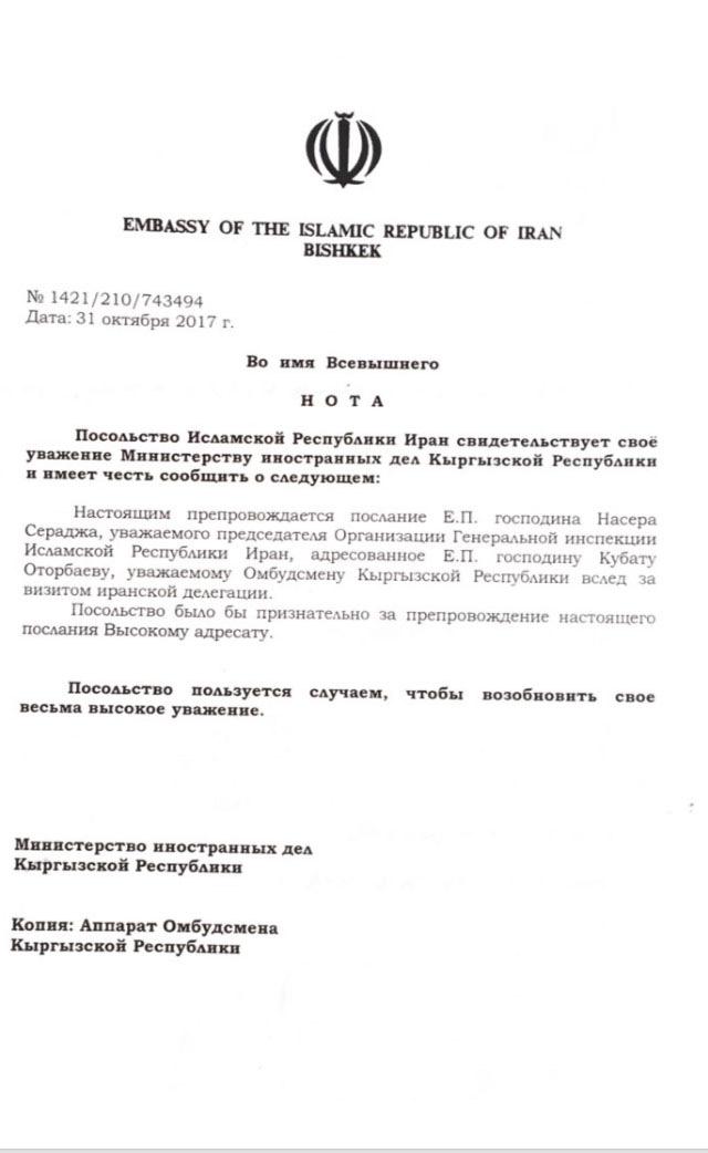 Кубат Оторбаев получил письмо от имени председателя Организации Генеральной инспекции Ирана Насера Сераджа с заверениями в его глубочайшем уважении