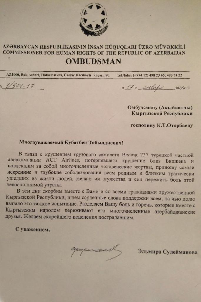 Первый Омбудсмен Азербайджана Эльмира Сулейманова выражает соболезнования в связи с авиакатастрофой
