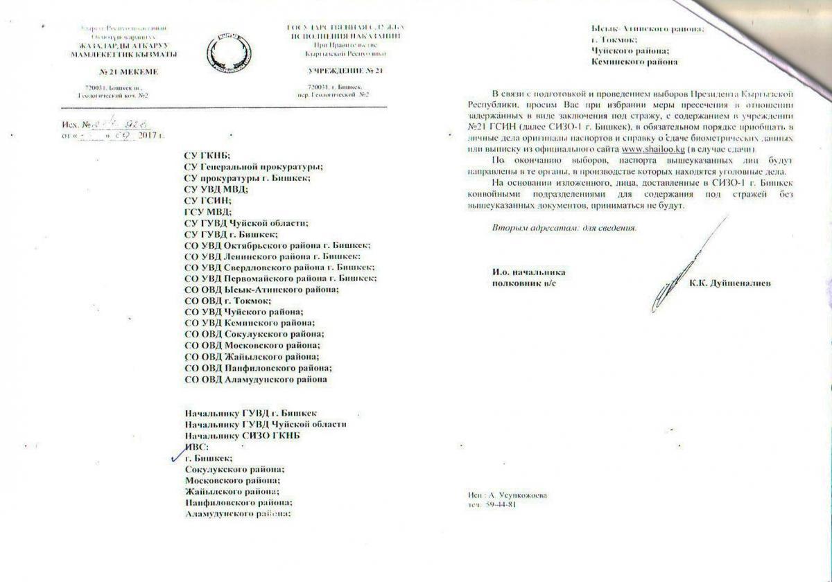 Это же подтверждается официальным письмом за подписью и.о. начальника СИЗО-1 К. Дуйшеналиева (исх. № 21/1 – 923 от 13.09.2017 г.), в адрес ИВС ГУВД г. Бишкек, в котором в частности говорится: «В связи с подготовкой и проведением выборов Президента Кыргызской Республики, просим Вас при избрании меры пресечения в отношении задержанных в виде заключения под стражу, с содержанием в учреждении №21 (СИЗО-1 г.Бишкек), в обязательном порядке приобщать в личные дела оригиналы паспортов и справку о сдаче биометрических данных или выписку из официального сайта www.shailoo.kg (в случае сдачи).
