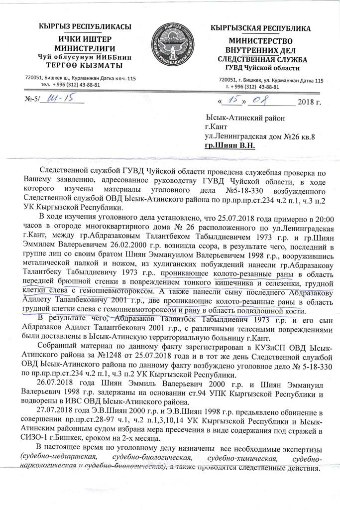 В частности, аппарат Омбудсмена КР вынужден констатировать, что вышеназванное опровержение руководства ГУВД Чуйской области противоречит их же ответу, данному семье Шиян 15.08.2018 г. за исх. №-5/Ш-15, а именно:
