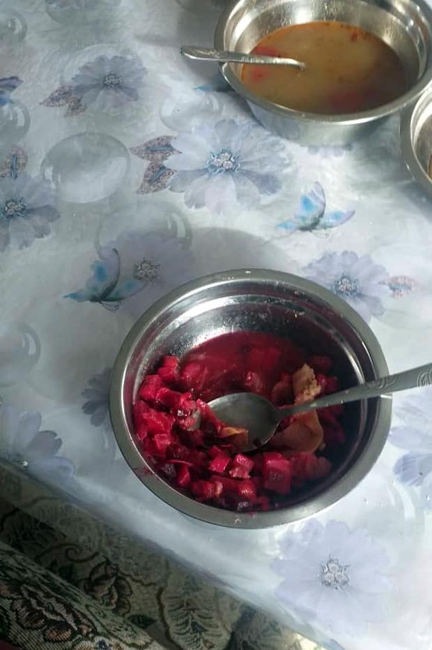На момент посещения в данном интернате был обеденный перерыв. Сразу, на что обратили внимание представители Акыйкатчы, было то, что детям второе блюдо и салат повара положили в одну посуду. Данный факт повар объяснила тем, что на всех 121 воспитанников посуды не хватает. Однако при этом сотрудники аппарата Омбудсмена увидели, что на полках в шкафу имеется дополнительная посуда, которая не используется для раздачи еды. Как пояснил повар, это посуда работников столовой, которую они принесли из своих домов, и что её все равно не хватит для обеспечения всех школьников.