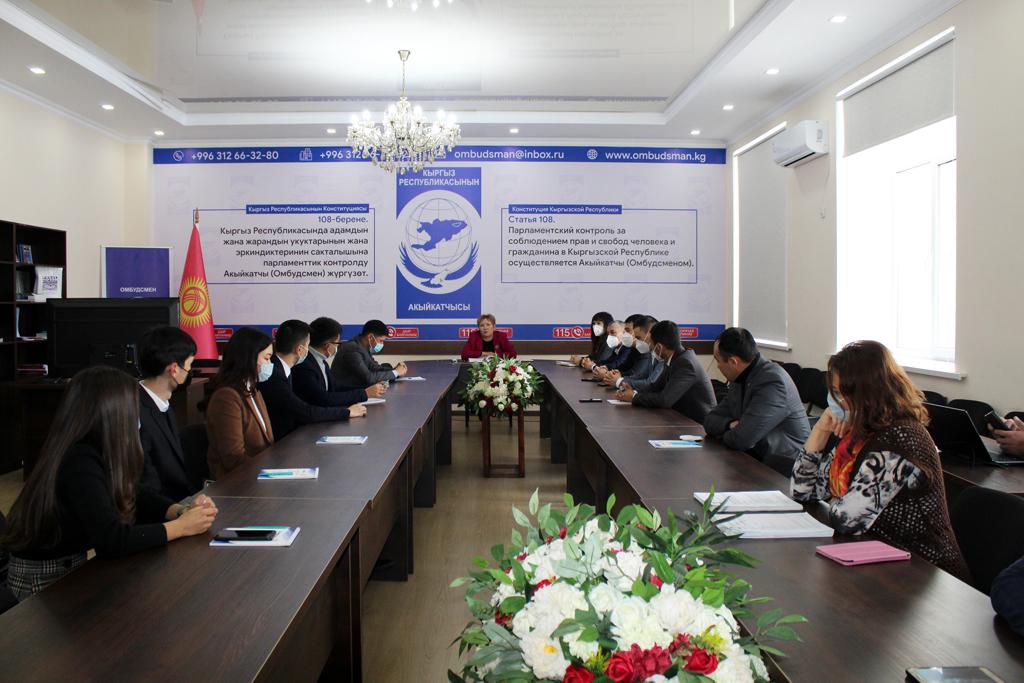 КР Акыйкатчы аппаратынын конференц-залында К.Карасаев атындагы Бишкек гуманитардык университетинин студенттери менен жолугушуу болуп өттү. Жолугушуу Адам укуктарынын жалпы декларациясынын кабыл алынганынын 72 жылдыгына карата КР Акыйкатчысы Токон Мамытов тарабынан жарыяланган бир айлыктын алкактарында өткөрүлдү. Иш чара КР Акыйкатчы аппаратынын балдардын, аялдардын жана үй-бүлө укуктарын коргоо бөлүмү тарабынан уюштурулуп, Акыйкатчы аппаратынын жооптуу кызматкерлеринин катышуусунда өттү.