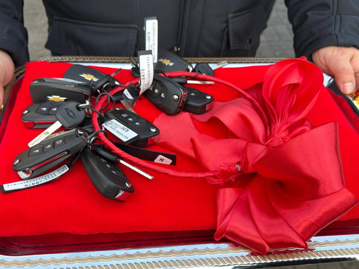 Каныбек Туманбаев Акыйкатчы Жамиля Жаманбаевага Chevrolet Cobalt үлгүсүндөгү 9 кызматтык автоунаанын ачкычтарын тапшырды.