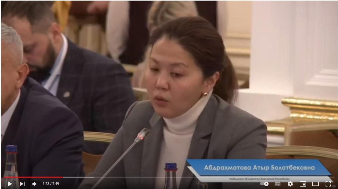 Акыйкатчы А.Абдрахматова: “Жаш муун бизден иштин форматтарын өзгөртүүнү талап кылууда, ага байланыштуу Омбудсмен институттары коомдун талаптарына сезимтал болуш керек. Биз өзүбүздүн негизги максатыбызды - адам укуктарынын жана эркиндигинин бузулушун алдын алуу иштерин күчөтүшүбүз керек”