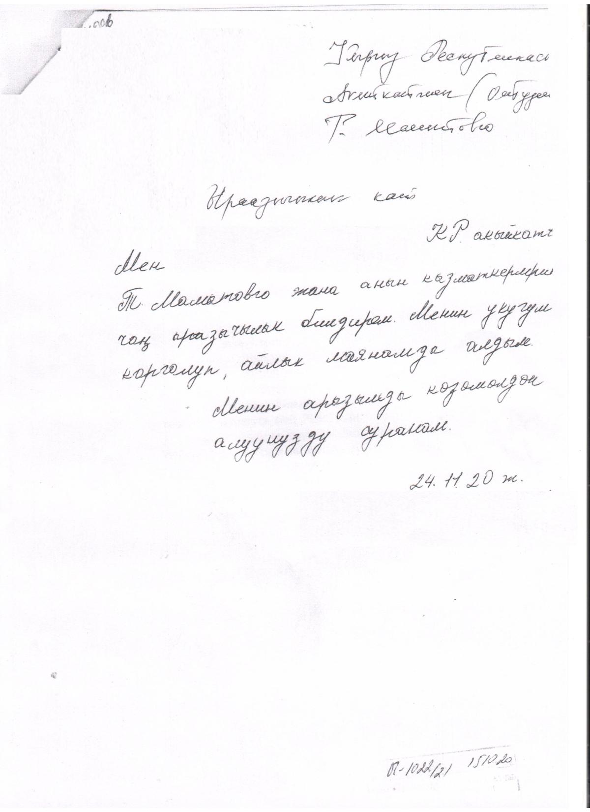 Кыргыз Республикасынын Акыйкатчысынын (Омбудсменинин) наамына  Бишкек шаарынын Профсоюз көчөсүнүн тургуну  Т. Ы-дан арыз келип түшкөн.