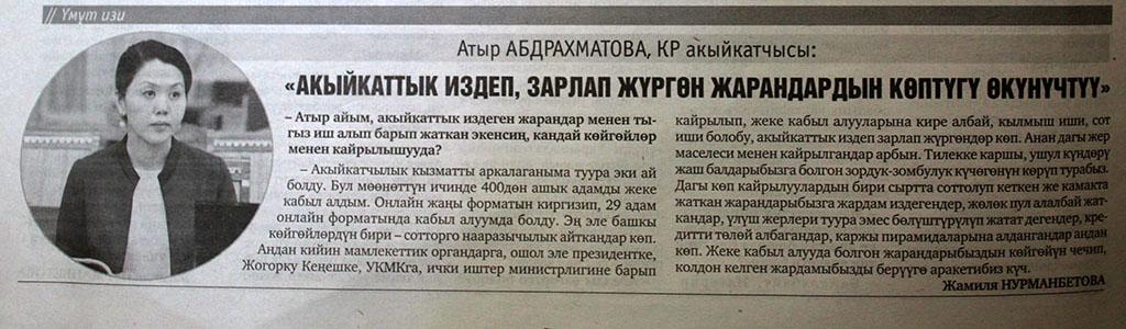 Кыргыз Республикасынын Акыйкатчы Атыр Абдрахматова “Азия news” коомдук-саясий гезитинин 2022-жылдын 12-майындагы (№19. 448 сандуу) чыгарылышында Акыйкатчынын ишмердүүлүгүнө байланышкан бир соболго жооп берди.