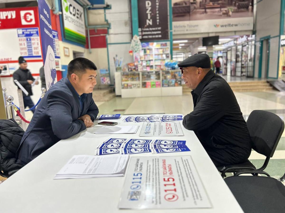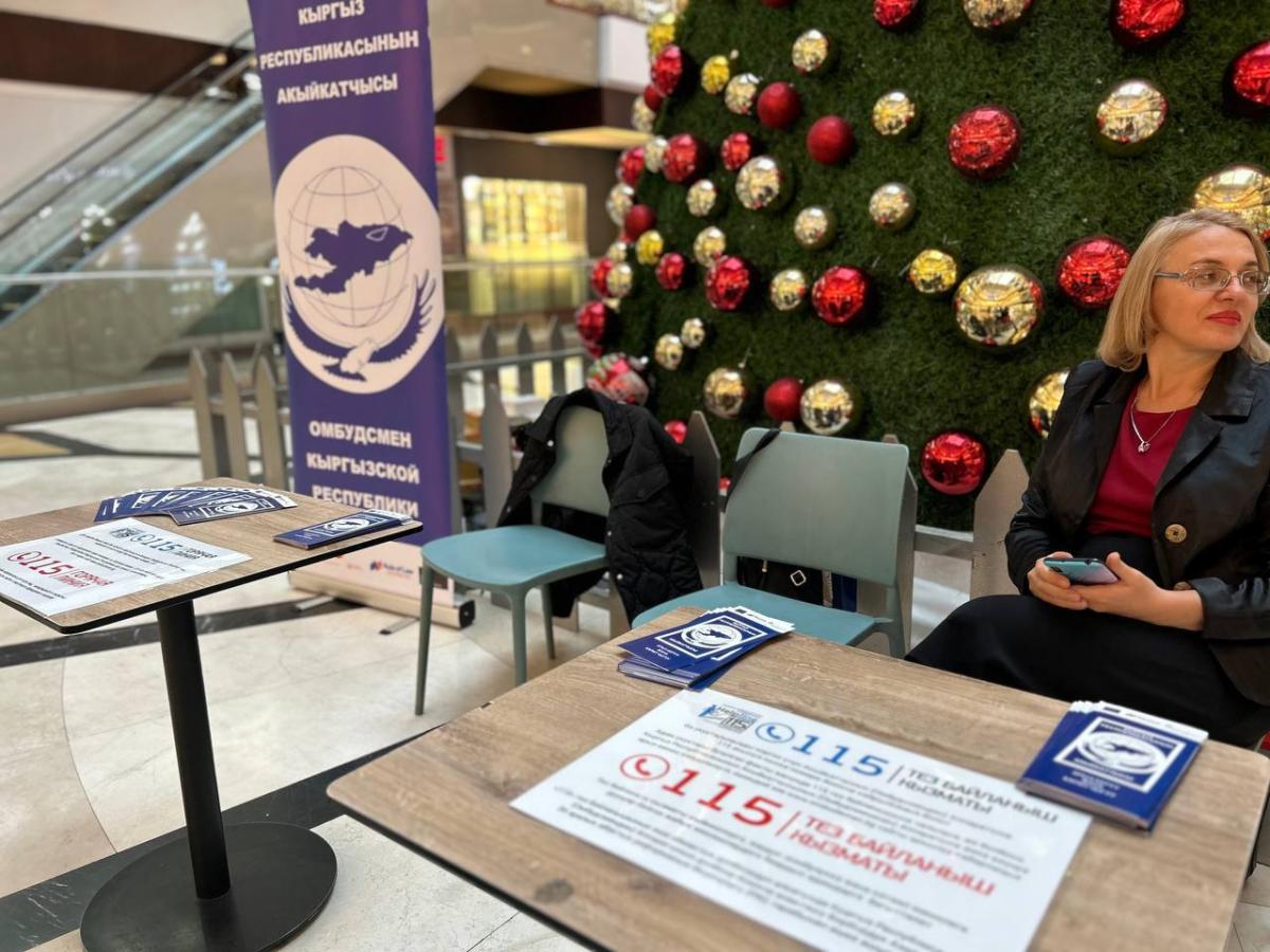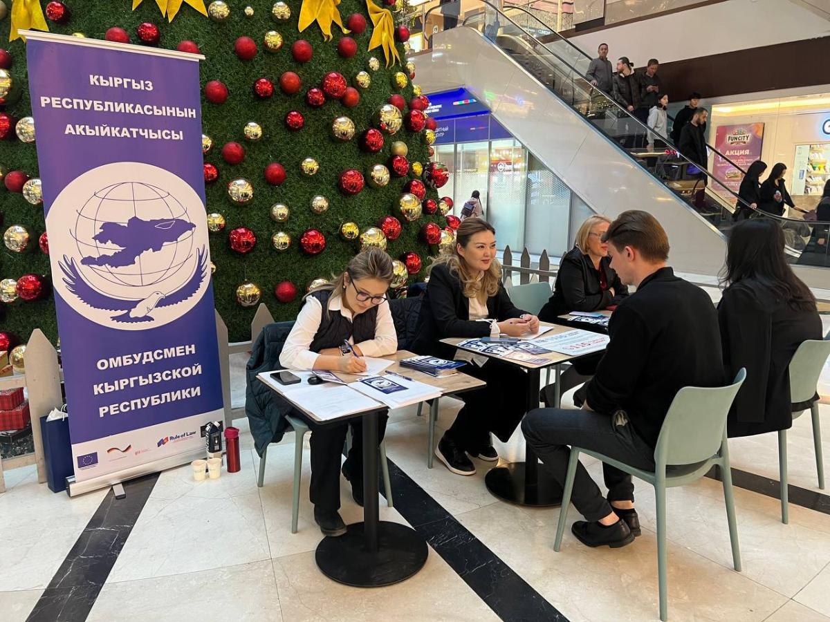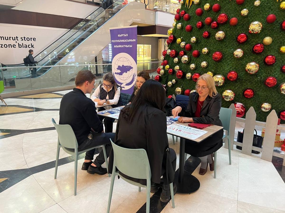 Бишкектеги соода борборлорунда Акыйкатчы (Омбудсмен) институтунун кызматкерлери кыргызстандык жарандар үчүн укуктук кеңештерди берип жатышат.