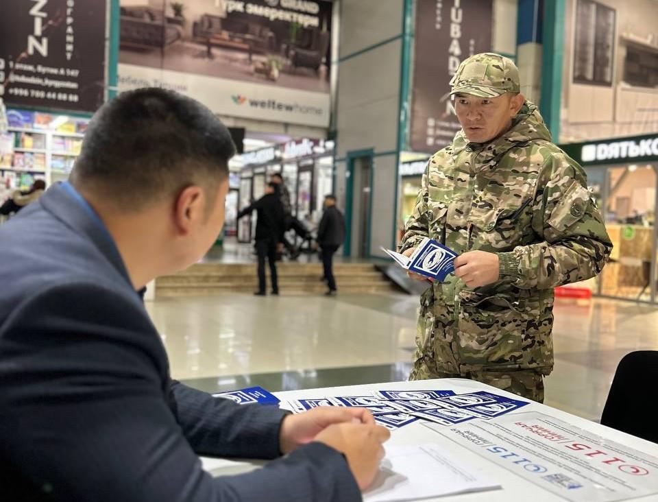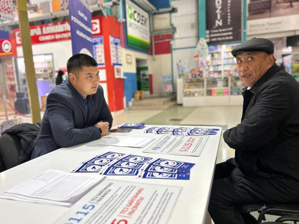 Бишкектеги соода борборлорунда Акыйкатчы институтунун кызматкерлери жарандар үчүн акысыз кеңештерди берип жатышат