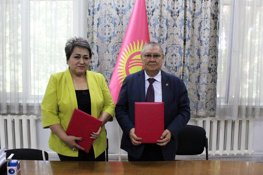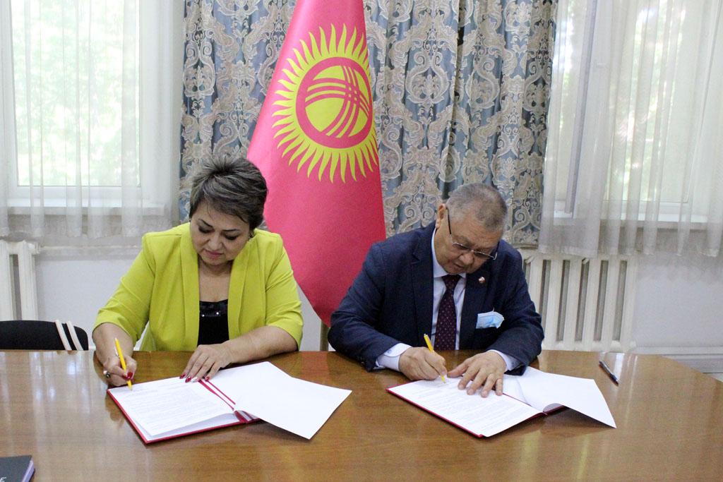 Кыргыз Республикасынын Акыйкатчысы (Омбудсмени) Токон Мамытов жана “Мамлекет кепилдеген юридикалык жардам (МКЮЖ) өнүктүрүү үчүн ӨЭУ улуттук тармагы” Координациялык кеңешинин төрагасы, “Укукту жана мыйзамдарды өнүктүрүү” коомдук фондунун директору Марипа Сейдалиева адам укуктары жана эркиндиктери чөйрөсүндө Меморандумга кол коюшту.