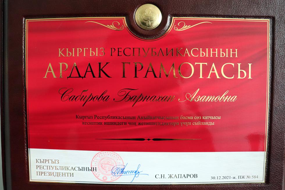 Кыргыз Республикасынын Акыйкатчы институтунун басма сөз катчысы Сабирова Б.А. Мамлекеттик жана ардактуу сыйлыкка татыктуу болду