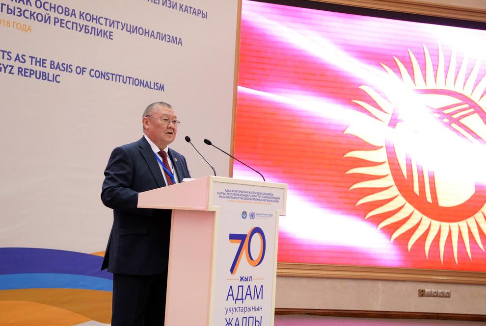 Урматтуу Сооронбай Шарипович, урматтуу аралык конференциянын катышуучулары. Адам укуктарынын жалпы декларациясынын 70 жылдыгын белгилөөнүн алкактарында Кыргыз Республикасынын Акыйкатчысы адам укуктарынын бир айлыгын жарыялады, анын алкактарында калктын адам укуктары чөйрөсүндөгү укуктук маалымдуулугун арттырууга багытталган иш чаралар ОБСЕ жана Сорос-Кыргызстан фонду менен биргеликте уюштурулду. Мүмкүнчүлүктөн пайдаланып, Акыйкатчы институту мындан ары да адам укуктары чөйрөсүндө мамлекеттик бийликтин бардык бутактары, эл аралык уюмдар жана жарандык сектор менен кызматташуусун улантат деп ишендирип кетмекчимин.