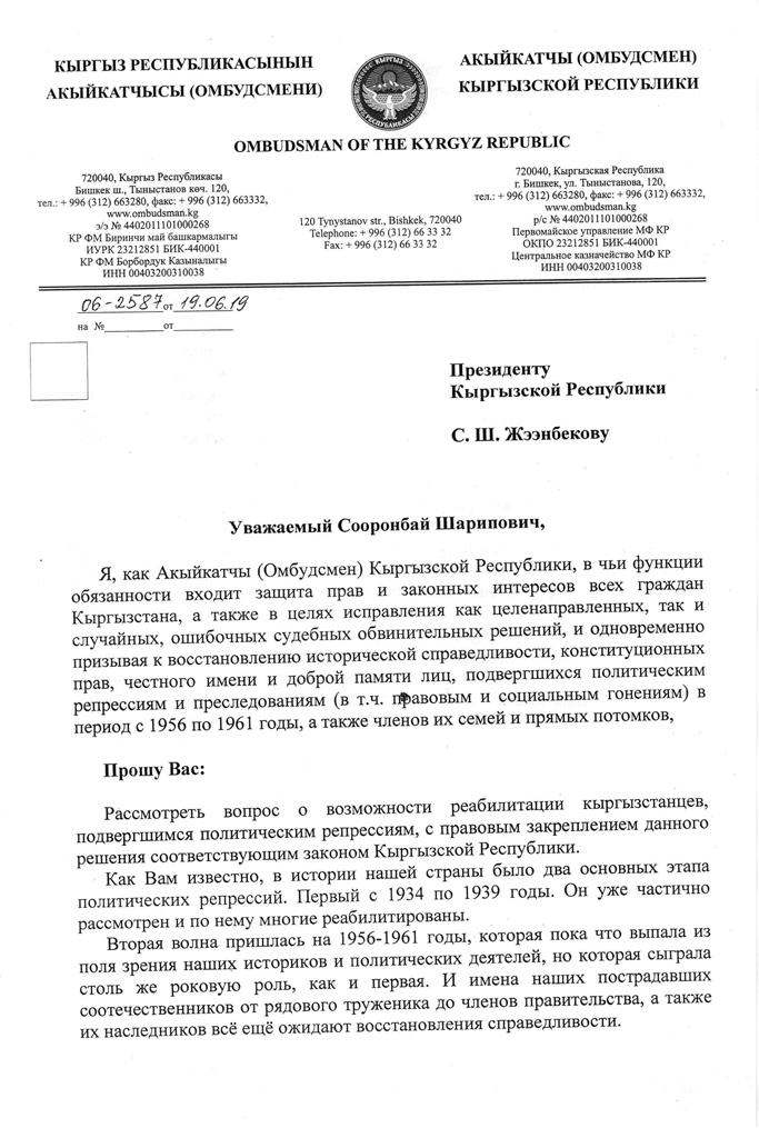 Акыйкатчы Токон Мамытов обратился к Президенту Кыргызской Республики с предложением рассмотреть вопрос о возможности реабилитации кыргызстанцев, подвергшихся политическим репрессиям и преследованиям в период с 1956 по 1961 годы