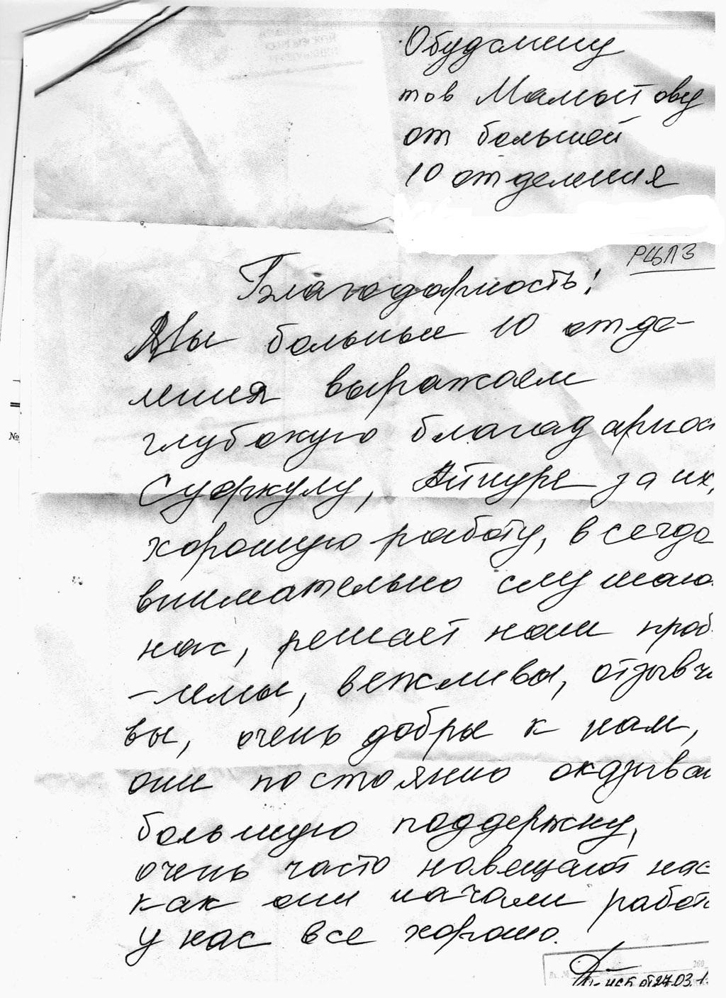 Мы, больные 10 отделения (РЦПЗ), выражаем глубокую благодарность Суеркулу, Айнуре (примечание пресс-службы: сотрудники Служба защиты прав пациентов, находящихся в психиатрических стационарах – Суеркул Сейдинов и Айнура Борубаева) за их хорошую работу, всегда внимательно слушают нас, решают наши проблемы, вежливы, отзывчивы, очень добры к нам, они постоянно оказывают большую поддержку, очень часто навещают нас, как они начали работать у нас все хорошо».
