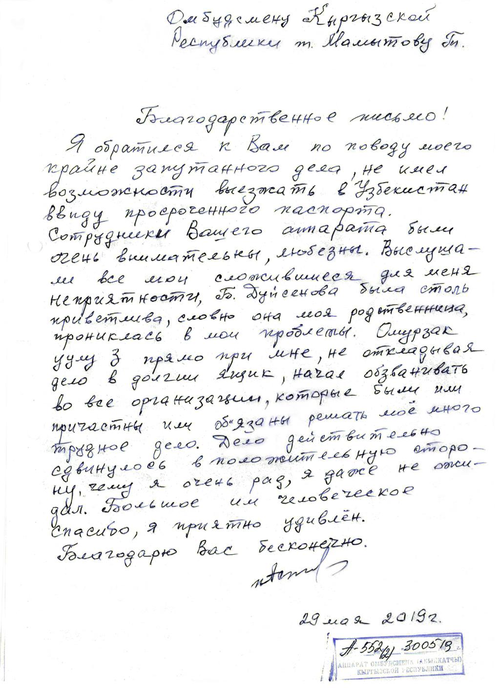 На имя Омбудсмена КР продолжают поступать благодарственные письма от заявителей, чьи вопросы решены положительно